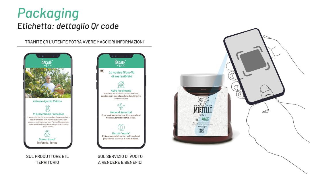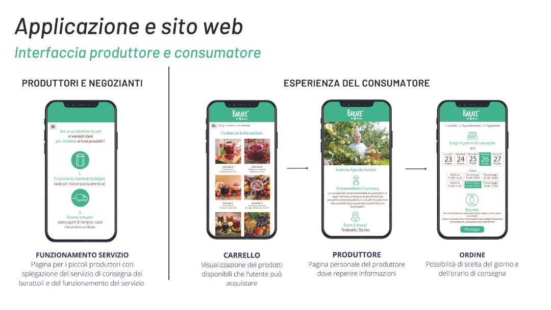 Il servizio “Baraté e Bun” è un sistema logistico che collega i produttori locali, i clienti finali e le sedi per la sterilizzazione dei contenitori in vetro per il “vuoto a rendere”. Il progetto quindi prevede la rivisitazione dei contenitori con la loro cassetta di trasporto, un’applicazione per gestire gli acquisti e le consegne e il sistema di trasporto ottimizzato.