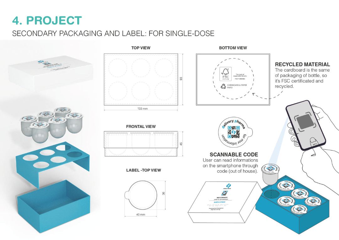 Dall’analisi dell’usabilità di un paziente e il ciclo di vita del packaging attuale, il progetto propone una bottiglia porta farmaci da utilizzare fuori casa, insieme a delle capsule monodose per farmaci in stato liquido o polvere.